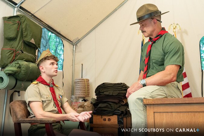 Scoutmaster Reece Scott punishes skinny-dipping Canyon Cole raw